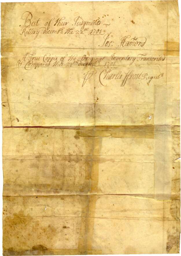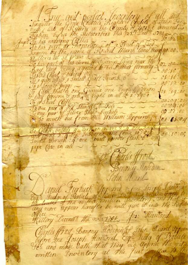 The following is the transcription of the inventory of the goods of John Furbush. The inventory was signed by Charles F. Frost, Bonony Hodsden, John Hand and Joseph Hammond. ![]() ![]() | |